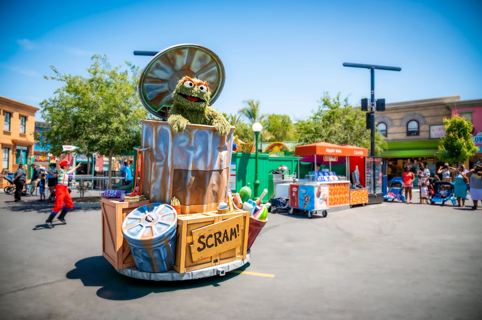 The parade takes place on the street between Cookie’s Monster Mixer and Sesame Souvenirs.